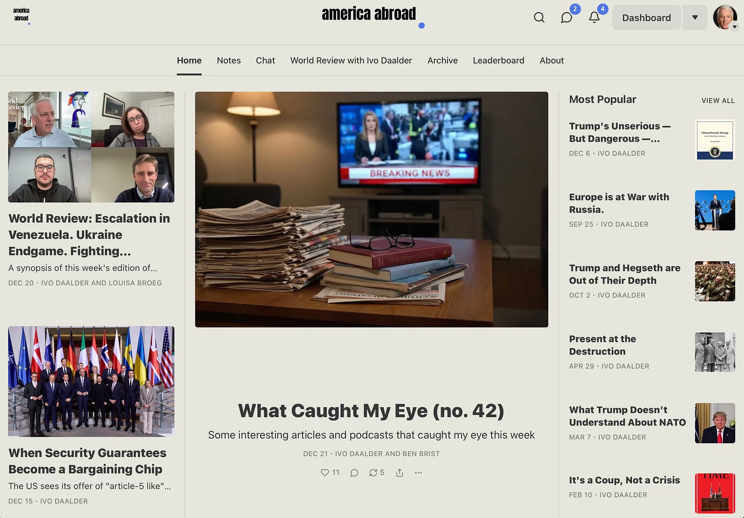 When I launched America Abroad, my goal was to provide a clear-eyed look at the forces reshaping our world. Looking back at the numbers, it’s clear that there is a deep, growing hunger for this kind of analysis. This year, I published 174 posts, and our community has expanded at a rate I never expected: overall subscribers are up 230%, and paid subscribers have increased by 350%.