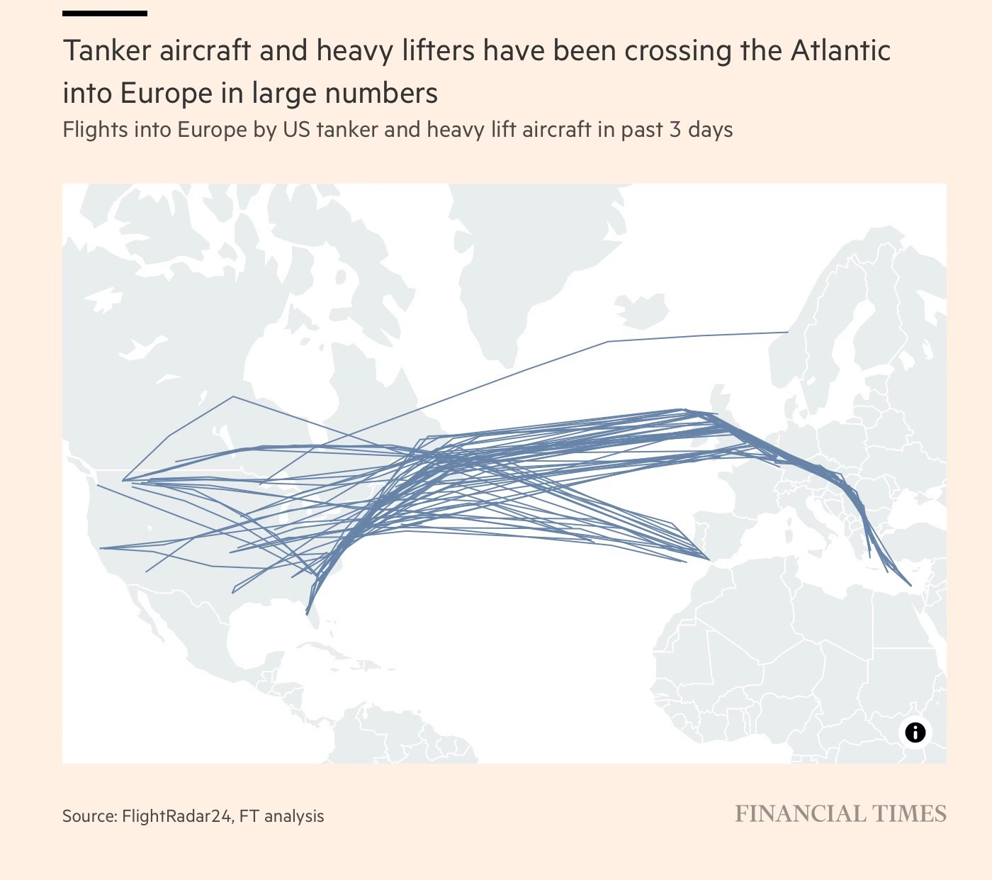 Dozens of refuelling and transport aircraft have crossed the Atlantic this week. Data from Flightradar24 shows 39 airborne tankers being repositioned to locations closer to the potential theatre of action in the past three days. A further 29 heavy-lift aircraft, such as the C-17 Globemaster III, have made runs to Europe in that time.