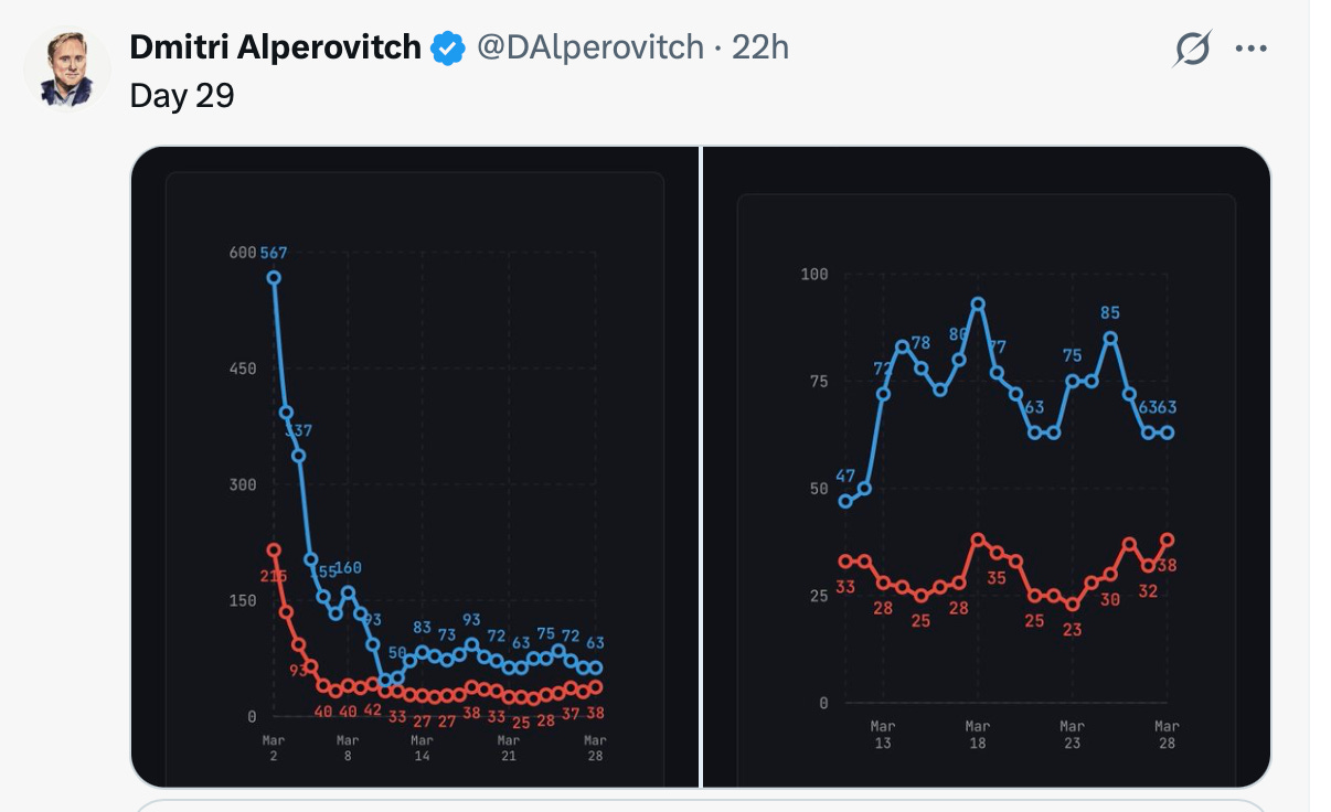 The administration, from the president on down, has made much of how effective the bombing campaign has been – notably with respect to destroying the ballistic missile threat, which was one of the principal reasons for going to war. We’re told, repeatedly, that Iran’s ballistic missile launches are down 90 percent. True. But largely irrelevant. The big question is what does Iran have left, and how much damage it can do. And on this, the news is not good. A report by Reuters cites five intelligence sources to argue the US can confirm that about a third of Iran’s missile arsenal has been destroyed, and perhaps another third buried deep underground and possibly destroyed. That still leaves a third of its arsenal intact. As a result, the rate of Iranian missile and drone fire has remained remarkably consistent – and their effectiveness, the New York Times reports, has steadily increased. Dmitri Alperovitz has tracked Iranian drone and missile strikes and his daily graphs are instructive.