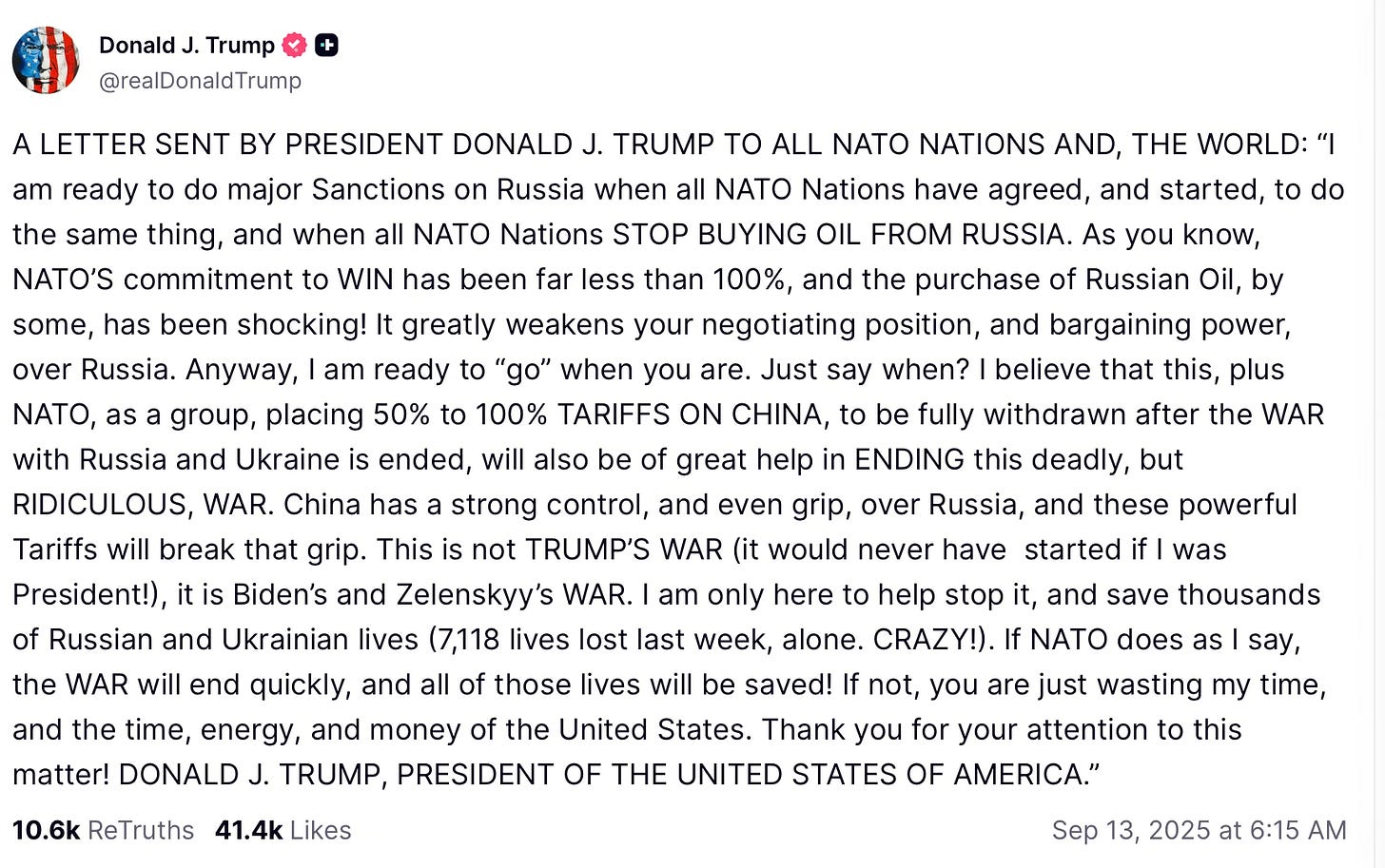Two weeks ago, on September 5, President Trump’s latest “two weeks” deadline for Russia to end the war with Ukraine came and went. Last Sunday, Trump posted a letter to NATO allies laying out his conditions for imposing sanctions on Russia.